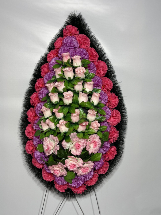 Модель от отечественного производителя имеет форму эллипса с остроугольными краями. Крупные розы различных сортов в окружении махровых гвоздик и соцветий мускари составляют основу композиции. Сиреневая цветовая гамма представлена на фоне ярко-зелёных пальмовых листьев разбавлена двумя белыми одиночными розами. Обрамлением служит хвойный лапник, увитый траурной лентой. Венок выражает охватившую сердце печаль и горькое сожаление о невозможности повернуть время вспять. Флористический материал выполнен из пластика, текстиля и проволоки