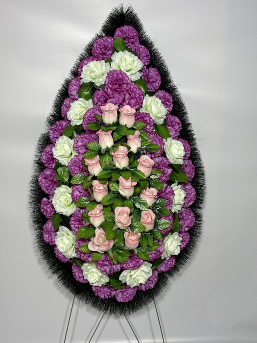Модель от отечественного производителя имеет форму эллипса с остроугольными краями. Крупные розы различных сортов в окружении махровых гвоздик и соцветий мускари составляют основу композиции. Сиреневая цветовая гамма представлена на фоне ярко-зелёных пальмовых листьев разбавлена двумя белыми одиночными розами. Обрамлением служит хвойный лапник, увитый траурной лентой. Венок выражает охватившую сердце печаль и горькое сожаление о невозможности повернуть время вспять. Флористический материал выполнен из пластика, текстиля и проволоки