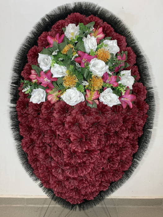 Венок овальной формы. Выполнен по эскизам современных флористов ритуальной индустрии. В состав композиции вошли бордовые розы, сиреневые гвоздики и разнотравье. Зелень для основы: хвойная гирлянда. Украшен оплетенной лентой белого цвета с золотой каймой. В изготовлении использованы текстиль, пластик, металлическая проволока. Высота: 120 см, ширина 65 см. Производство: Россия