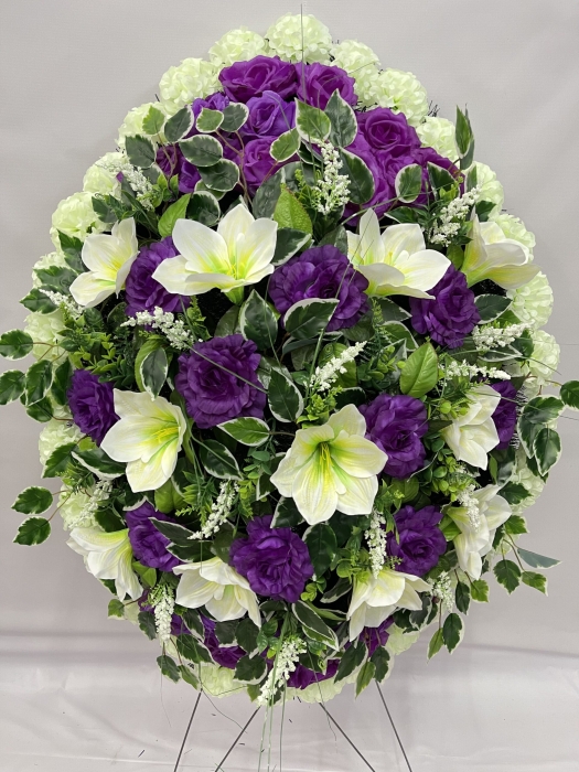 Модель от отечественного производителя имеет форму эллипса с остроугольными краями. Крупные розы различных сортов в окружении махровых гвоздик и соцветий мускари составляют основу композиции. Сиреневая цветовая гамма представлена на фоне ярко-зелёных пальмовых листьев разбавлена двумя белыми одиночными розами. Обрамлением служит хвойный лапник, увитый траурной лентой. Венок выражает охватившую сердце печаль и горькое сожаление о невозможности повернуть время вспять. Флористический материал выполнен из пластика, текстиля и проволоки