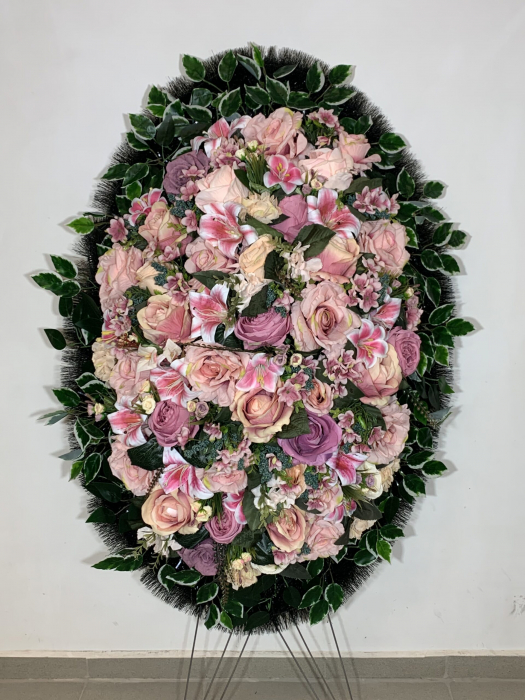 Модель от отечественного производителя имеет форму эллипса с остроугольными краями. Крупные розы различных сортов в окружении махровых гвоздик и соцветий мускари составляют основу композиции. Сиреневая цветовая гамма представлена на фоне ярко-зелёных пальмовых листьев разбавлена двумя белыми одиночными розами. Обрамлением служит хвойный лапник, увитый траурной лентой. Венок выражает охватившую сердце печаль и горькое сожаление о невозможности повернуть время вспять. Флористический материал выполнен из пластика, текстиля и проволоки