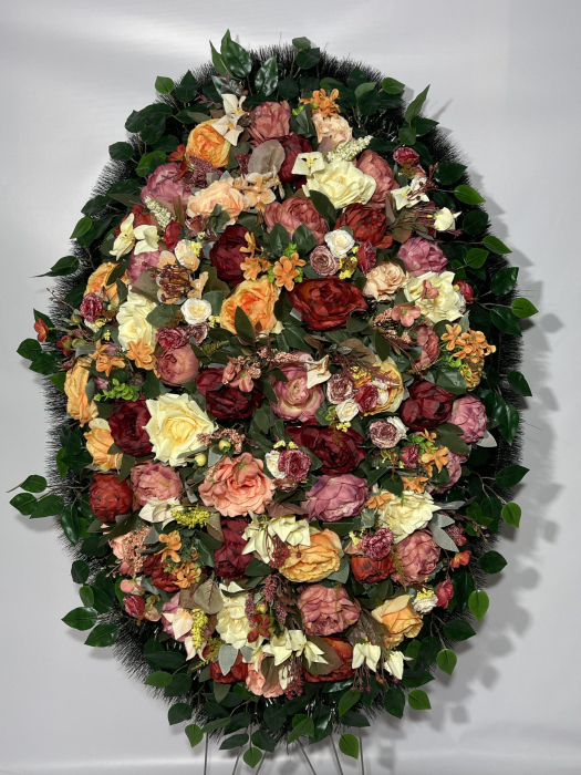 Модель от отечественного производителя имеет форму эллипса с остроугольными краями. Крупные розы различных сортов в окружении махровых гвоздик и соцветий мускари составляют основу композиции. Сиреневая цветовая гамма представлена на фоне ярко-зелёных пальмовых листьев разбавлена двумя белыми одиночными розами. Обрамлением служит хвойный лапник, увитый траурной лентой. Венок выражает охватившую сердце печаль и горькое сожаление о невозможности повернуть время вспять. Флористический материал выполнен из пластика, текстиля и проволоки