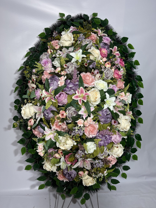Модель от отечественного производителя имеет форму эллипса с остроугольными краями. Крупные розы различных сортов в окружении махровых гвоздик и соцветий мускари составляют основу композиции. Сиреневая цветовая гамма представлена на фоне ярко-зелёных пальмовых листьев разбавлена двумя белыми одиночными розами. Обрамлением служит хвойный лапник, увитый траурной лентой. Венок выражает охватившую сердце печаль и горькое сожаление о невозможности повернуть время вспять. Флористический материал выполнен из пластика, текстиля и проволоки
