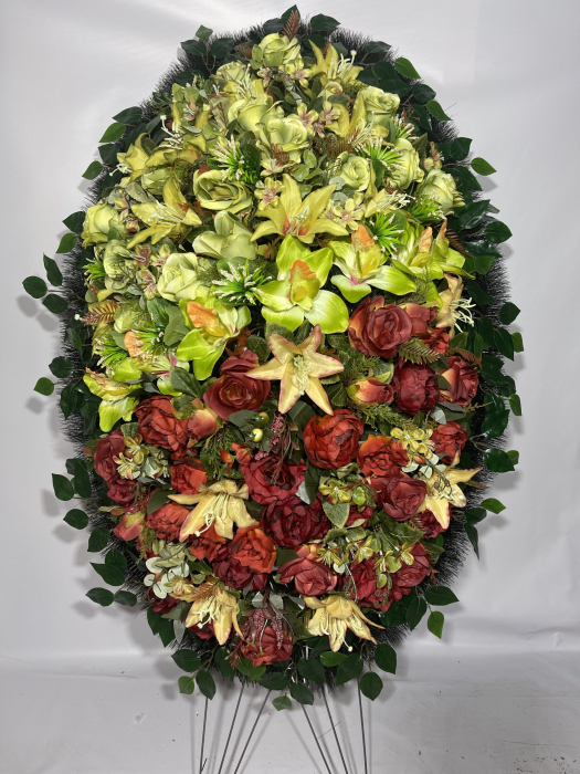 Модель от российского изготовителя имеет форму эллипса с остроугольными краями. Основу составляют крупные красные гвоздики, повторяющие конфигурацию венка. Белые арабисы и лилии небольшим вкраплением разбавляют композицию. Фоном служат ветви вечнозелёных растений, перевитые золотисто-красной лентой. Алая цветовая гамма призвана выразить всю безутешность постигшего горя. Флористический материал выполнен из ткани и пластика, каркас – из проволоки