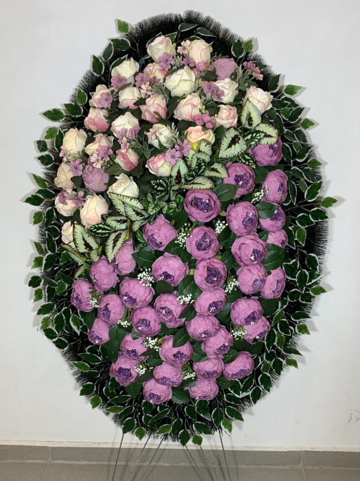 Модель от отечественного производителя имеет форму эллипса с остроугольными краями. Крупные розы различных сортов в окружении махровых гвоздик и соцветий мускари составляют основу композиции. Сиреневая цветовая гамма представлена на фоне ярко-зелёных пальмовых листьев разбавлена двумя белыми одиночными розами. Обрамлением служит хвойный лапник, увитый траурной лентой. Венок выражает охватившую сердце печаль и горькое сожаление о невозможности повернуть время вспять. Флористический материал выполнен из пластика, текстиля и проволоки