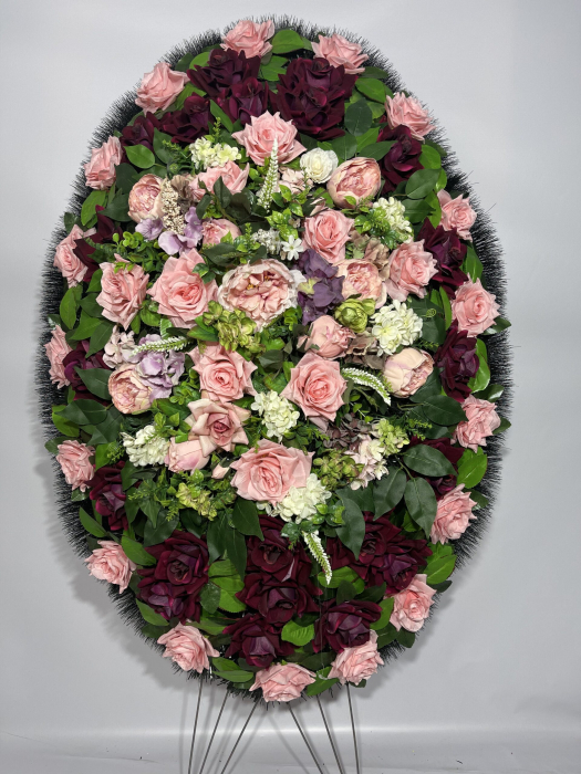 Модель от отечественного производителя имеет форму эллипса с остроугольными краями. Крупные розы различных сортов в окружении махровых гвоздик и соцветий мускари составляют основу композиции. Сиреневая цветовая гамма представлена на фоне ярко-зелёных пальмовых листьев разбавлена двумя белыми одиночными розами. Обрамлением служит хвойный лапник, увитый траурной лентой. Венок выражает охватившую сердце печаль и горькое сожаление о невозможности повернуть время вспять. Флористический материал выполнен из пластика, текстиля и проволоки