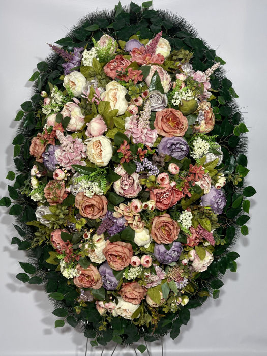 Модель от отечественного производителя имеет форму эллипса с остроугольными краями. Крупные розы различных сортов в окружении махровых гвоздик и соцветий мускари составляют основу композиции. Сиреневая цветовая гамма представлена на фоне ярко-зелёных пальмовых листьев разбавлена двумя белыми одиночными розами. Обрамлением служит хвойный лапник, увитый траурной лентой. Венок выражает охватившую сердце печаль и горькое сожаление о невозможности повернуть время вспять. Флористический материал выполнен из пластика, текстиля и проволоки
