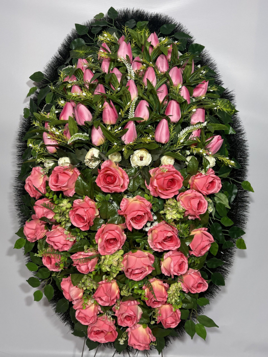 Модель от отечественного производителя имеет форму эллипса с остроугольными краями. Крупные розы различных сортов в окружении махровых гвоздик и соцветий мускари составляют основу композиции. Сиреневая цветовая гамма представлена на фоне ярко-зелёных пальмовых листьев разбавлена двумя белыми одиночными розами. Обрамлением служит хвойный лапник, увитый траурной лентой. Венок выражает охватившую сердце печаль и горькое сожаление о невозможности повернуть время вспять. Флористический материал выполнен из пластика, текстиля и проволоки