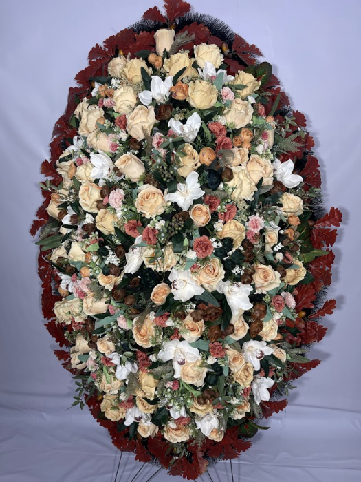 Ритуальный аксессуар в формате эллипса наполнен торжественности и печали. Ярко-жёлтые хризантемы и палевые розы в нижней части атрибута невольно привлекают к себе внимание. Верх композиции представлен ванильного окраса розами, молочно-белым пиретрумом и стрелками садовых лилий с полураспустившимися бутонами. Разделителем служат изысканно уложенные листья тёмно-зелёной аспидистры и веточки малахитового рускуса итало. По краю цветочного решения можно увидеть ряд из бутонов роз лососевого окраса. Базис конструкции декорирован еловым лапником и широкими листьями финиковой пальмы нефритового колера. Растительные компоненты предоставлены элитными парковыми хозяйствами РФ. Изготовитель: штатные флористы. Параметры: 180 см в длину, 120 см в ширину