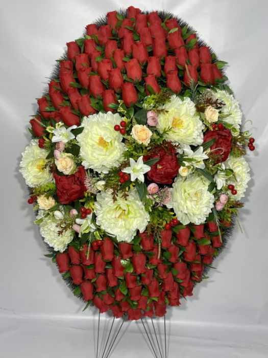 Модель от российского изготовителя имеет форму эллипса с остроугольными краями. Основу составляют крупные красные гвоздики, повторяющие конфигурацию венка. Белые арабисы и лилии небольшим вкраплением разбавляют композицию. Фоном служат ветви вечнозелёных растений, перевитые золотисто-красной лентой. Алая цветовая гамма призвана выразить всю безутешность постигшего горя. Флористический материал выполнен из ткани и пластика, каркас – из проволоки. Размеры: 140 см высота, 75-80 см ширина