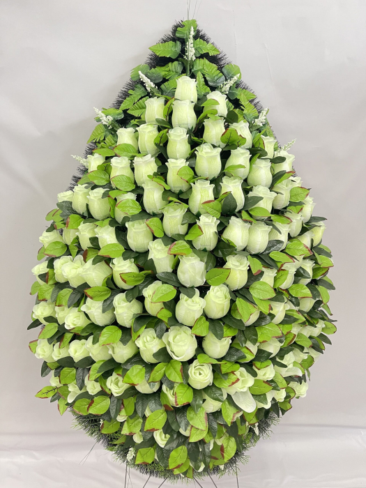 Конструкция отечественного изготовителя имеет силуэт водяной капли. Внутри ельника, украшенного белой с золотистой каймой лентой расположена основная композиция. Многочисленные белые лилии, клематисы, хризантемы и розы воспевают чистоту и снизошедшую на усопшего благодать. Цветовое решение символизирует всепрощение и милость Господа. В модели использован высококачественный текстиль, пластик, каркас из металла