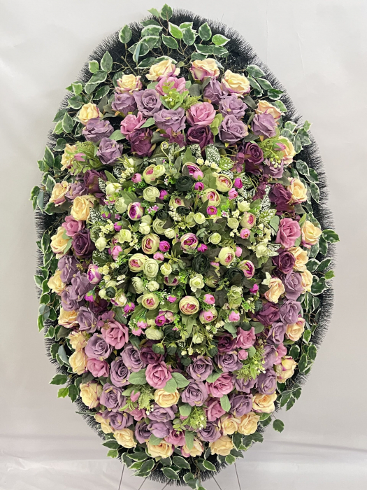 Модель от отечественного производителя имеет форму эллипса с остроугольными краями. Крупные розы различных сортов в окружении махровых гвоздик и соцветий мускари составляют основу композиции. Сиреневая цветовая гамма представлена на фоне ярко-зелёных пальмовых листьев разбавлена двумя белыми одиночными розами. Обрамлением служит хвойный лапник, увитый траурной лентой. Венок выражает охватившую сердце печаль и горькое сожаление о невозможности повернуть время вспять. Флористический материал выполнен из пластика, текстиля и проволоки