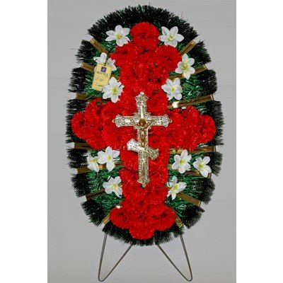 Модель от российского изготовителя имеет форму эллипса с остроугольными краями. Основу составляют крупные красные гвоздики, повторяющие конфигурацию венка. Белые арабисы и лилии небольшим вкраплением разбавляют композицию. Фоном служат ветви вечнозелёных растений, перевитые золотисто-красной лентой. Алая цветовая гамма призвана выразить всю безутешность постигшего горя. Флористический материал выполнен из ткани и пластика, каркас – из проволоки. Размеры: 140 см высота, 75-80 см ширина